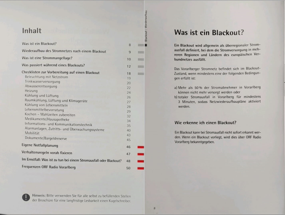 Un român stabilit în Austria i-a trimis jurnalistei Iosefina Pascal o broșură care l-a lăsat mască. Broșura a primit-o în căsuța poștală, chiar de la primăria din Vorarlberg, semnată de însuși primarul orașului. În această cărticică de noaptea minții se prezintă cu lux de amănunte ce este un blackout, cât poate dura, de la trei ore până la zile întregi, și alte astfel de detalii, inclusiv o serie de chestionare prin care se stabilește ce fel de sistem de încălzire folosești în propria locuință. În funcție de sistemul pe care îl ai, primești sfaturi pentru situațiile în care rămâi fără curent și astfel nu mai funcționează electrocasnicele. Totodată, sunt menționate canalele oficiale de comunicare, postul național de radio din Austria și posturile de televiziune naționale.
